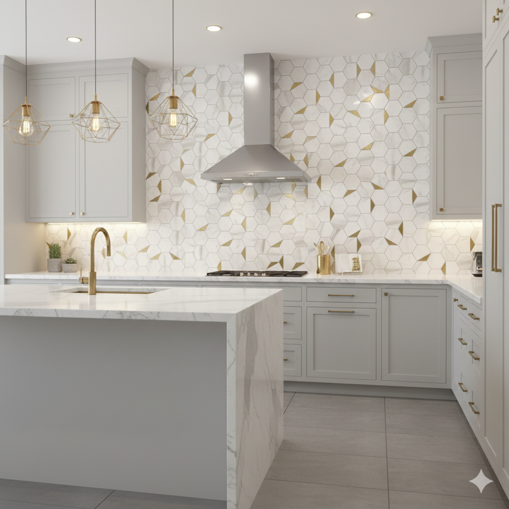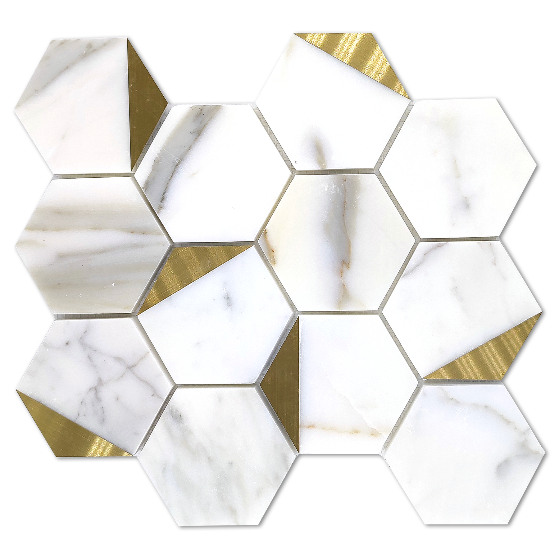 | Product | Nostalgia - Calacatta Gold Marble Mosaic Tile 3" Hexagon w/Brass - Polished |