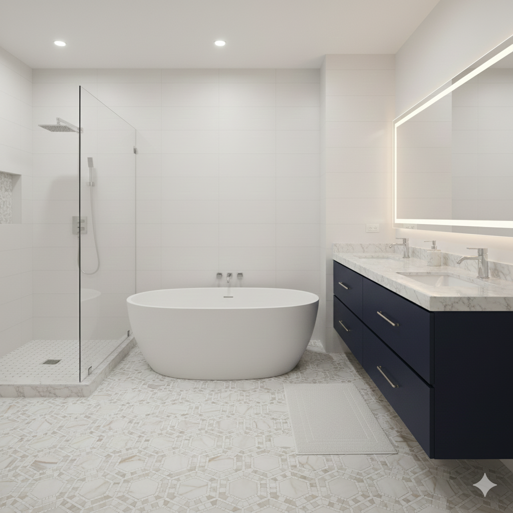 Our Ovation Collection offers an elegant Calacatta Gold Premium in a large hexagon pattern, complemented by Thassos Mosaic tile for an exquisite look with an extra hint of glimmer. The polished marble in white tones creates a luxurious and timeless atmosphere.